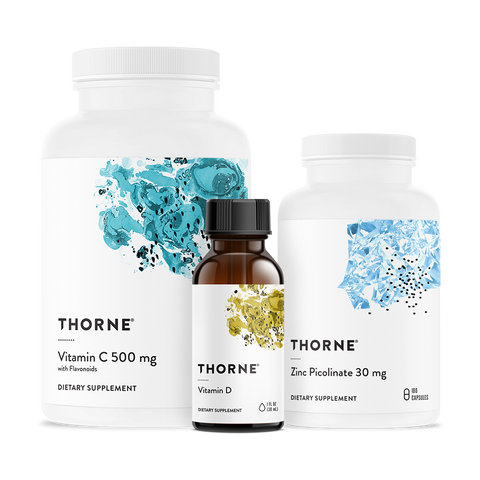 O Immune Support Bundle da Thorne® reúne três suplementos essenciais concebidos para apoiar o funcionamento normal do sistema imunitário em fases de maior exigência física, stress ou alterações sazonais. Este conjunto combina Zinco Picolinato, Vitamina D líquida e Vitamina C com flavonoides, nutrientes fundamentais para o equilíbrio e bem-estar geral. O zinco contribui para a função normal do sistema imunitário, a vitamina D apoia igualmente ossos e músculos, e a vitamina C contribui para a proteção das células contra o stress oxidativo e para a formação normal de colagénio. Com fórmulas de elevada qualidade e fácil utilização, este bundle oferece uma abordagem prática e completa ao suporte nutricional diário.